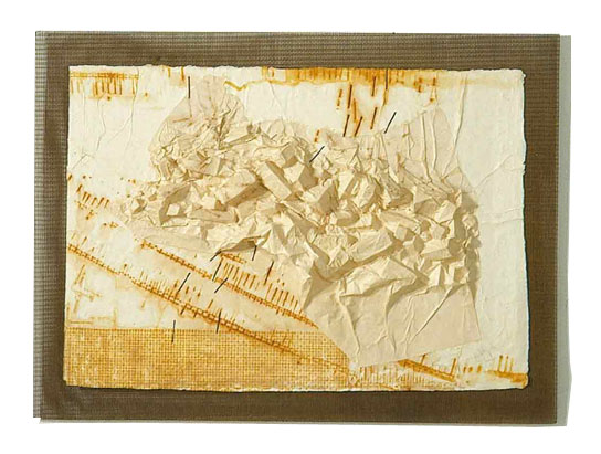 Prägerelief in Japanpapier mit Rostmalen auf rostigem Gewebe 84 x 113 cm 1996